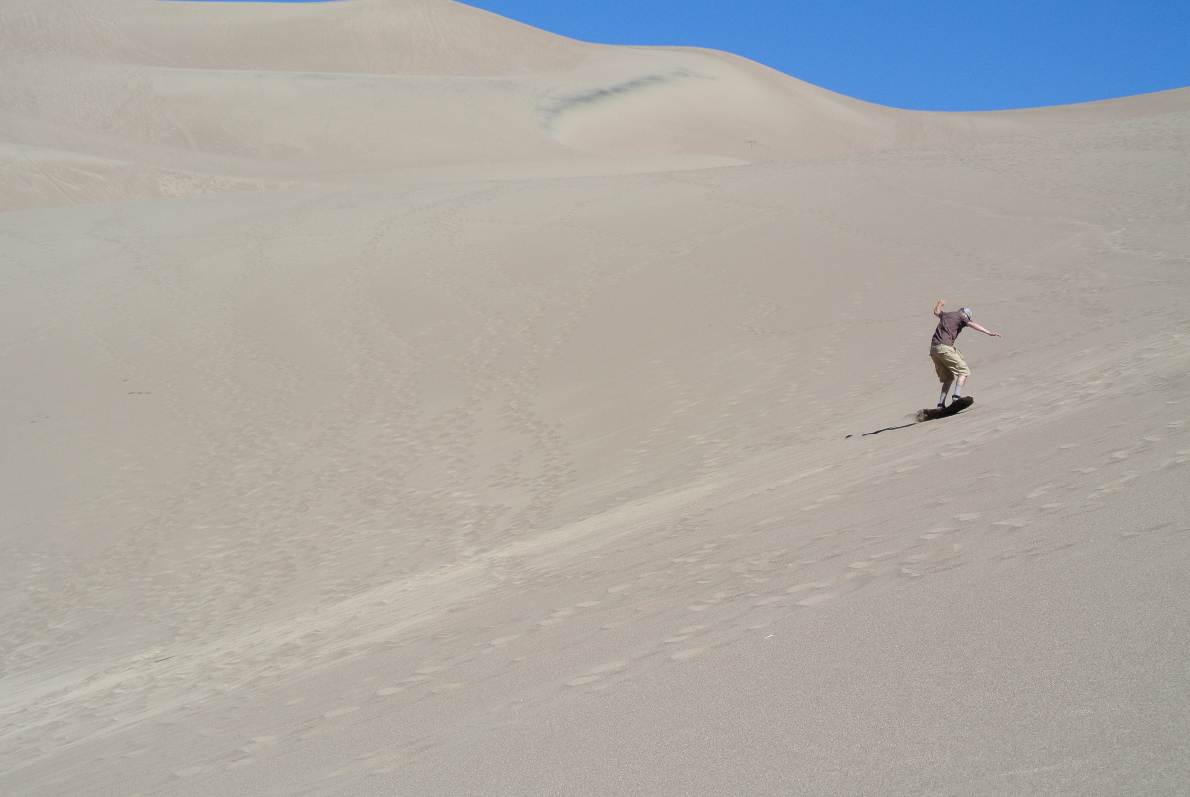 Luckily, the fun wasn’t over.  We (mostly Matt) had been hauling a sand board up and over mounds and mounds of sand for hours.  He went down first.  It took some getting used to, but once we did it was a lot of fun!  We got down a whole lot quicker than going up.  Once at the bottom we took a few more turns running up and down the dunes before giving up.