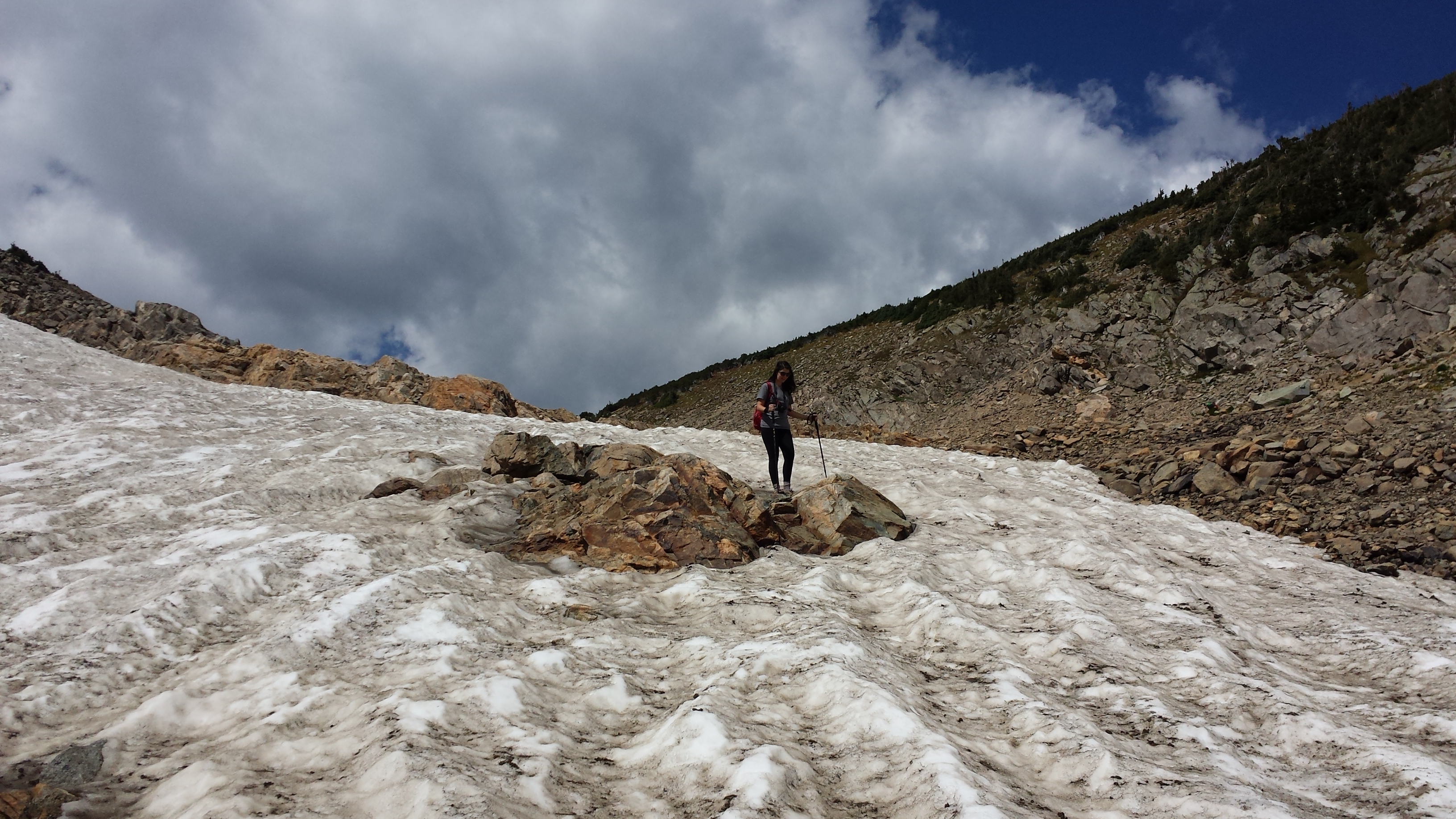 We packed everything up and discussed the game plan on getting down. There were two options: back down the rocky edge (boring yet safe) OR glacier straight down the snow field on our feet (terrifying, exhilarating, and not so safe). Of course we picked the latter. When could we say that we glaciered down a mountain in AUGUST? We were smart enough to pack our hiking poles so with one deep breath off we went. Picture ice skating, in hiking shoes, at a snail’s speed, downward, while constantly trying to catch yourself from tumbling off the edge… SO much fun!