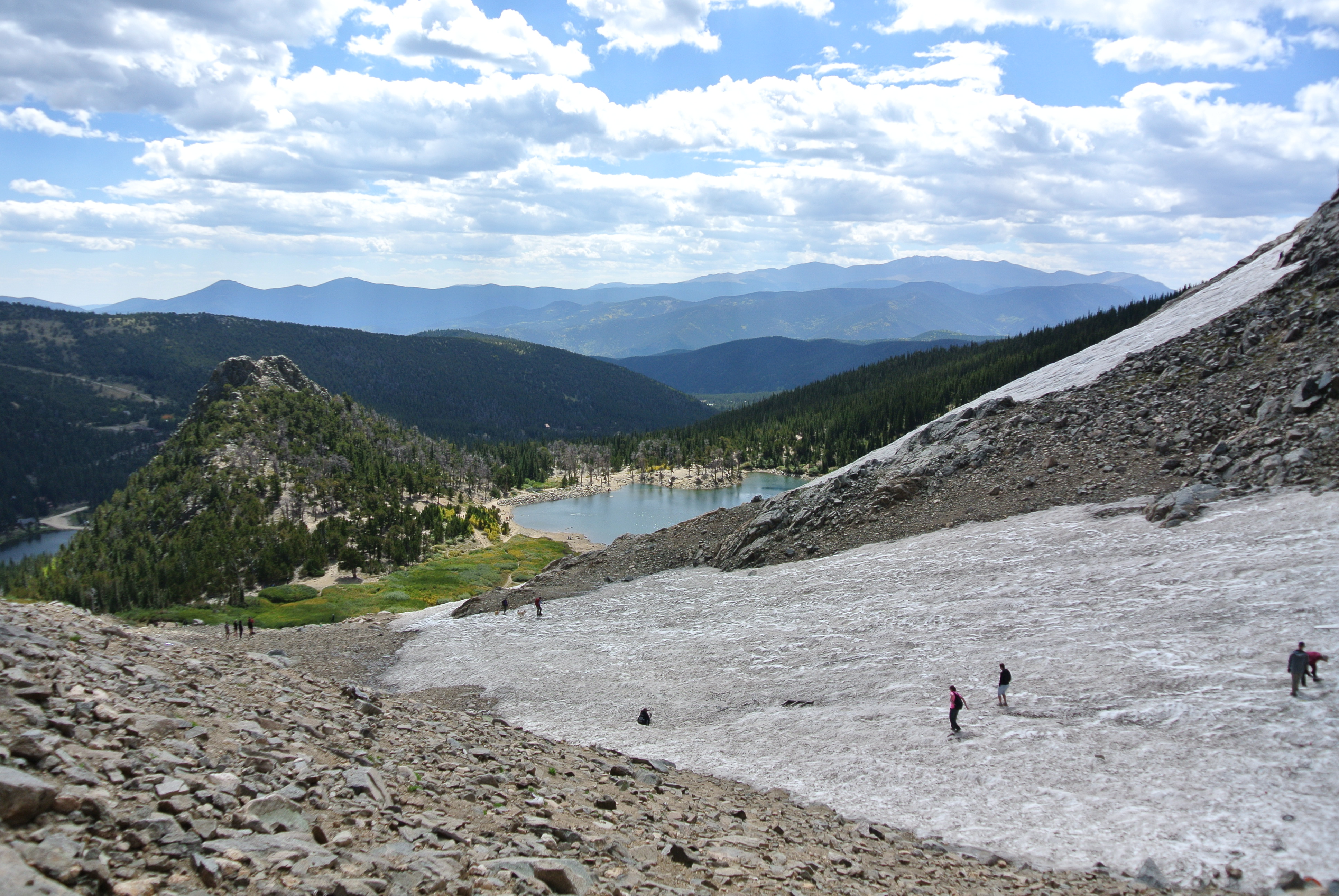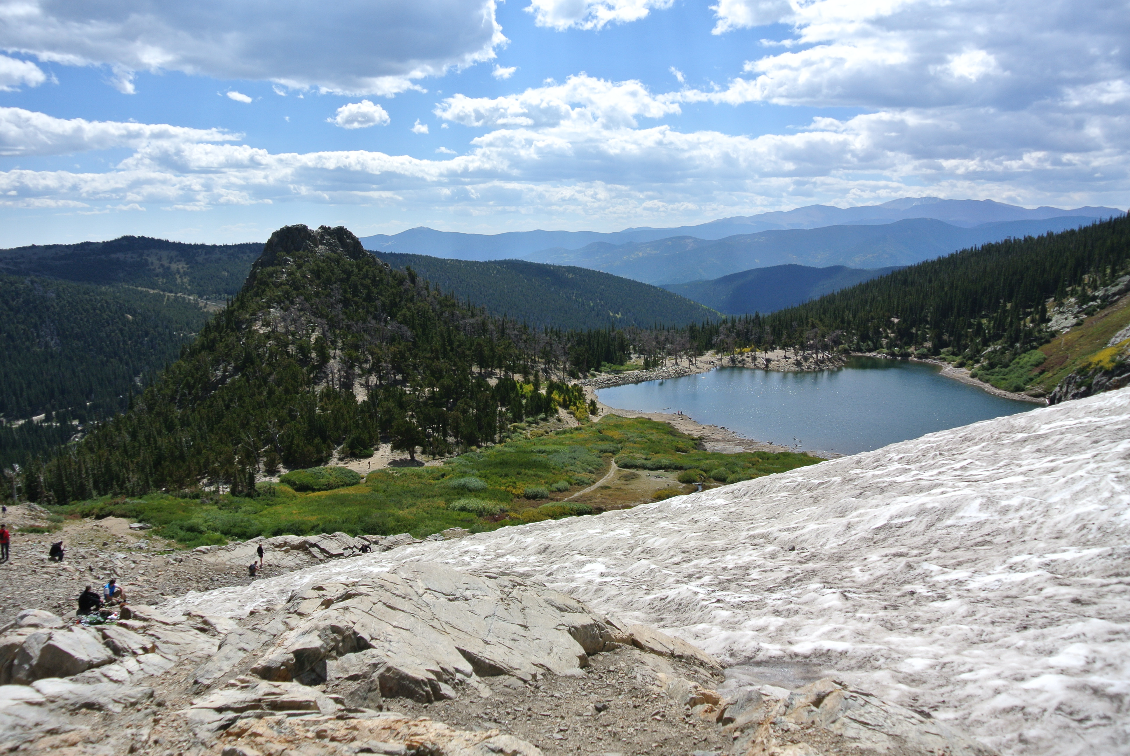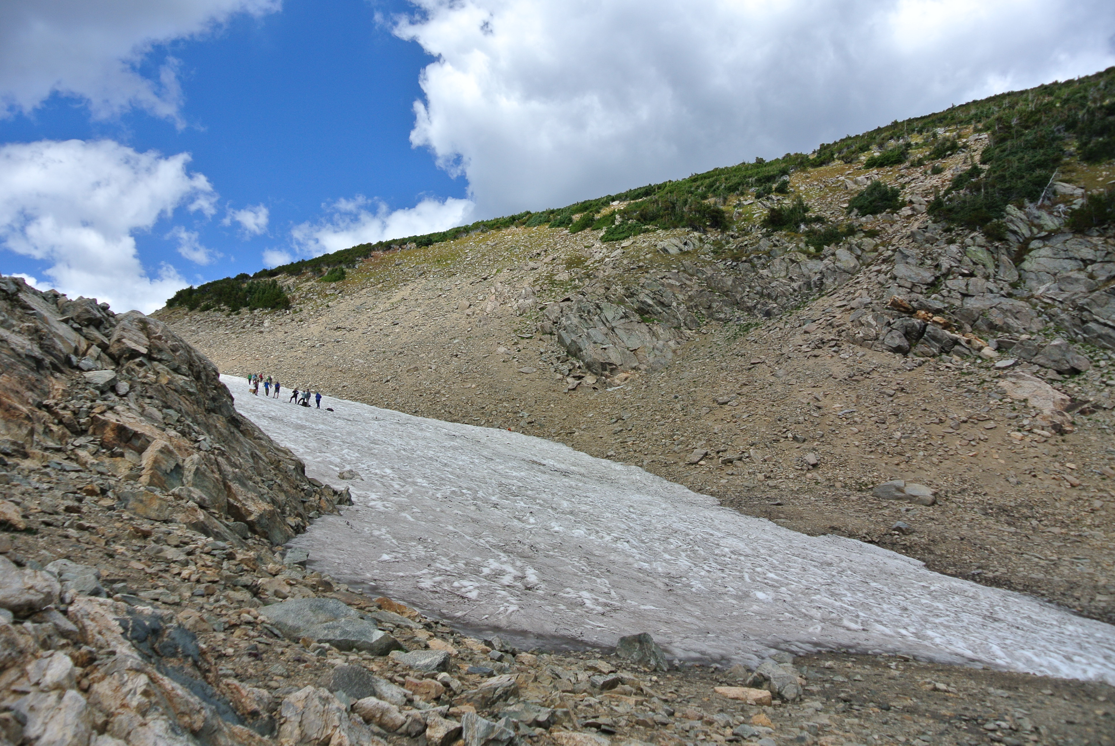 The trail winds around the right side of the lake straight up the rocks. We went in August and there was still a large snow field up and over the ridge. We scrambled along the edge for a while until we came across a group of geologists measuring the depth of the ice. We paused for a bit to watch their work.