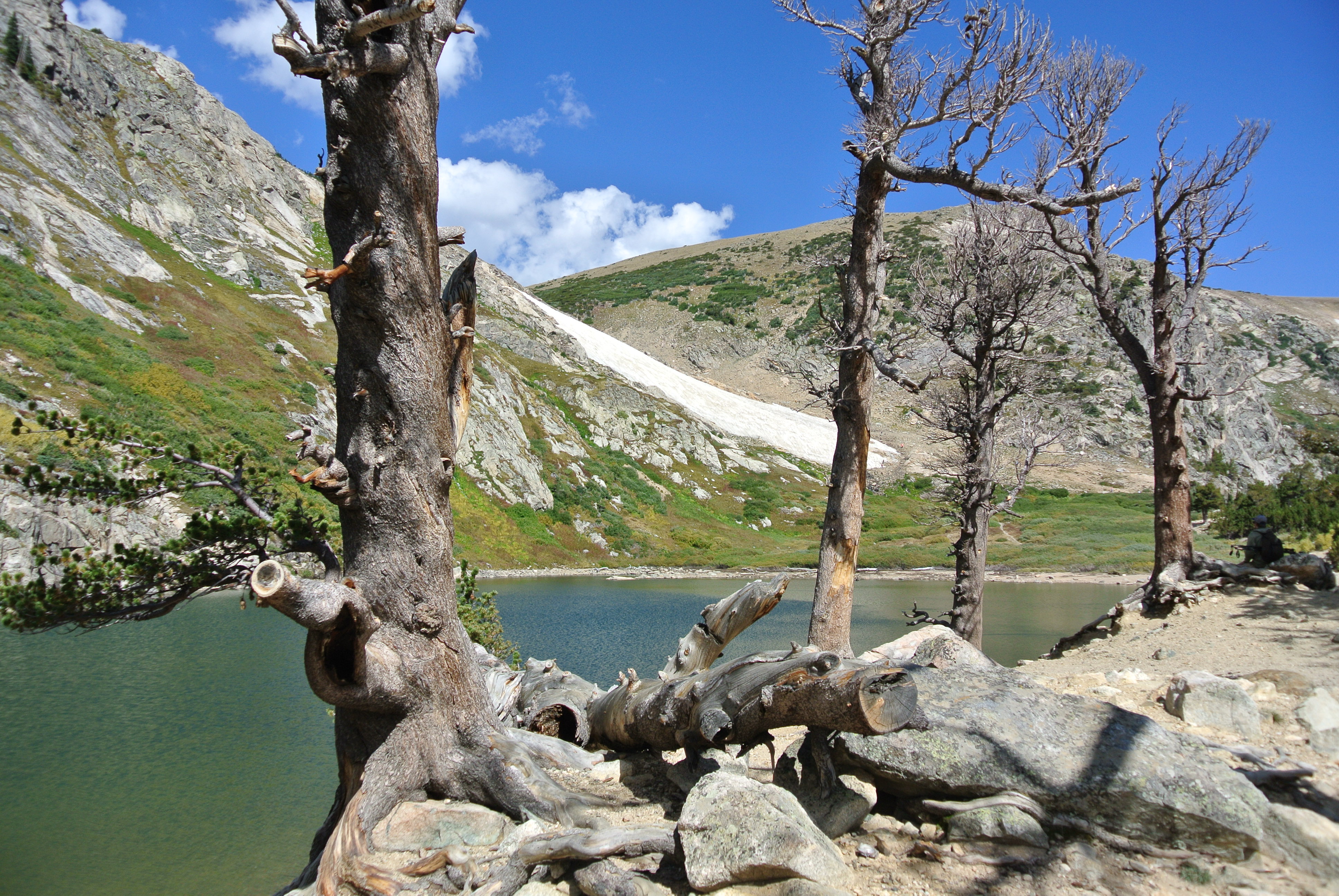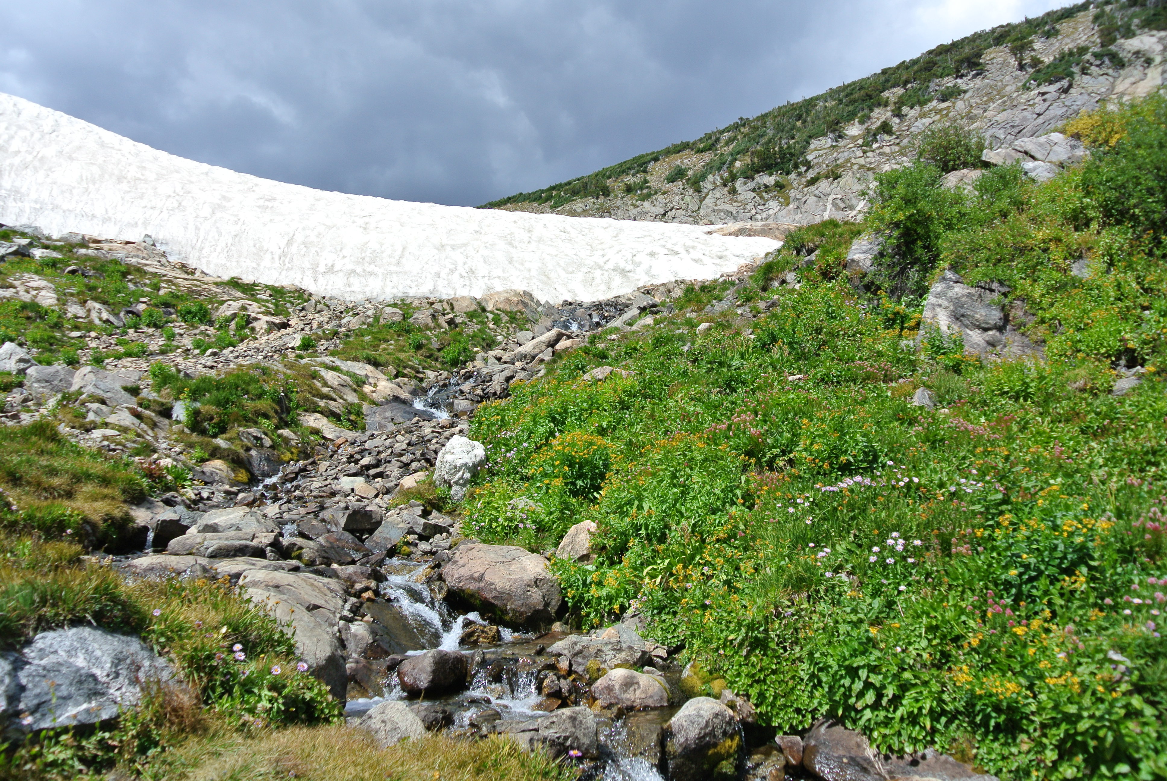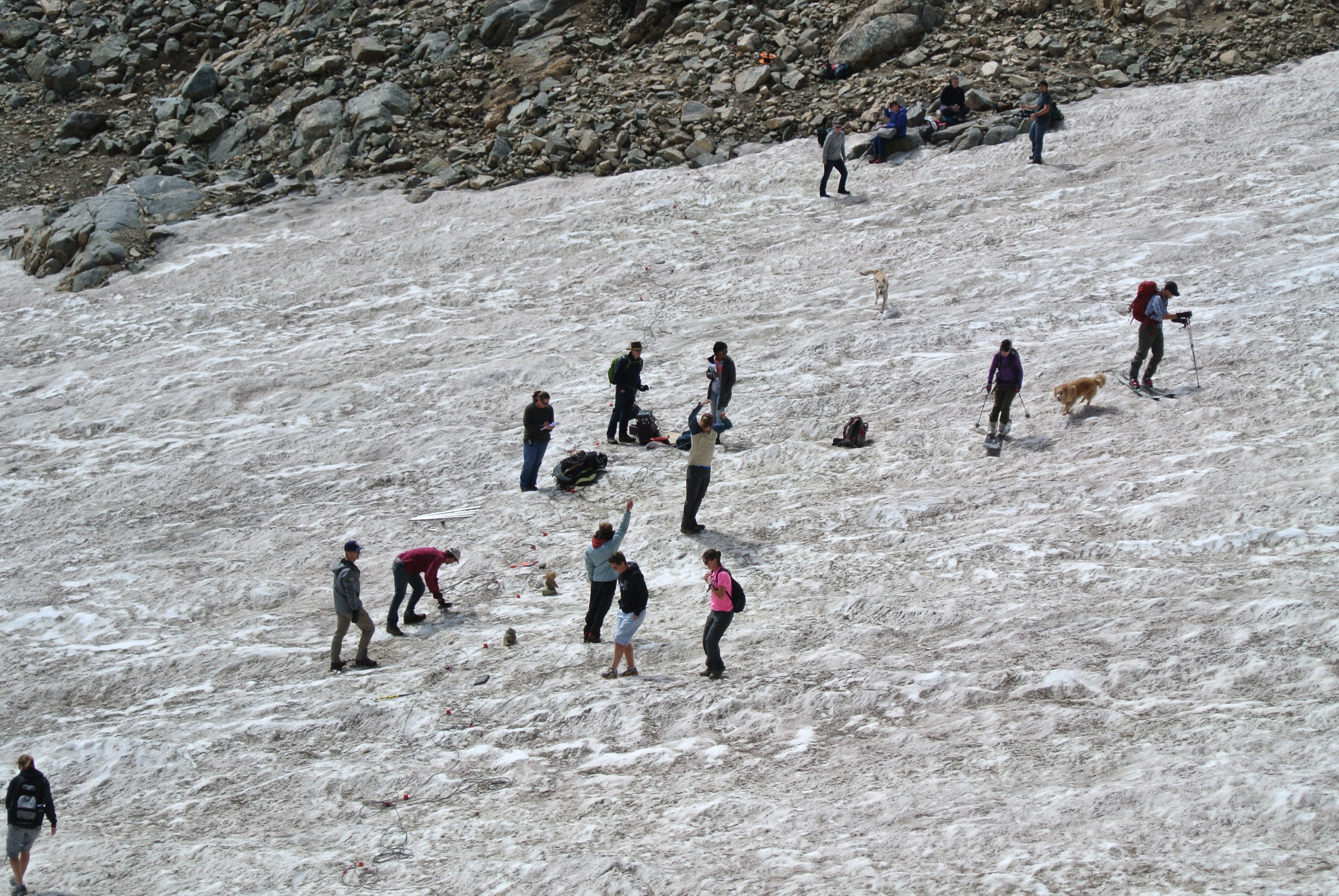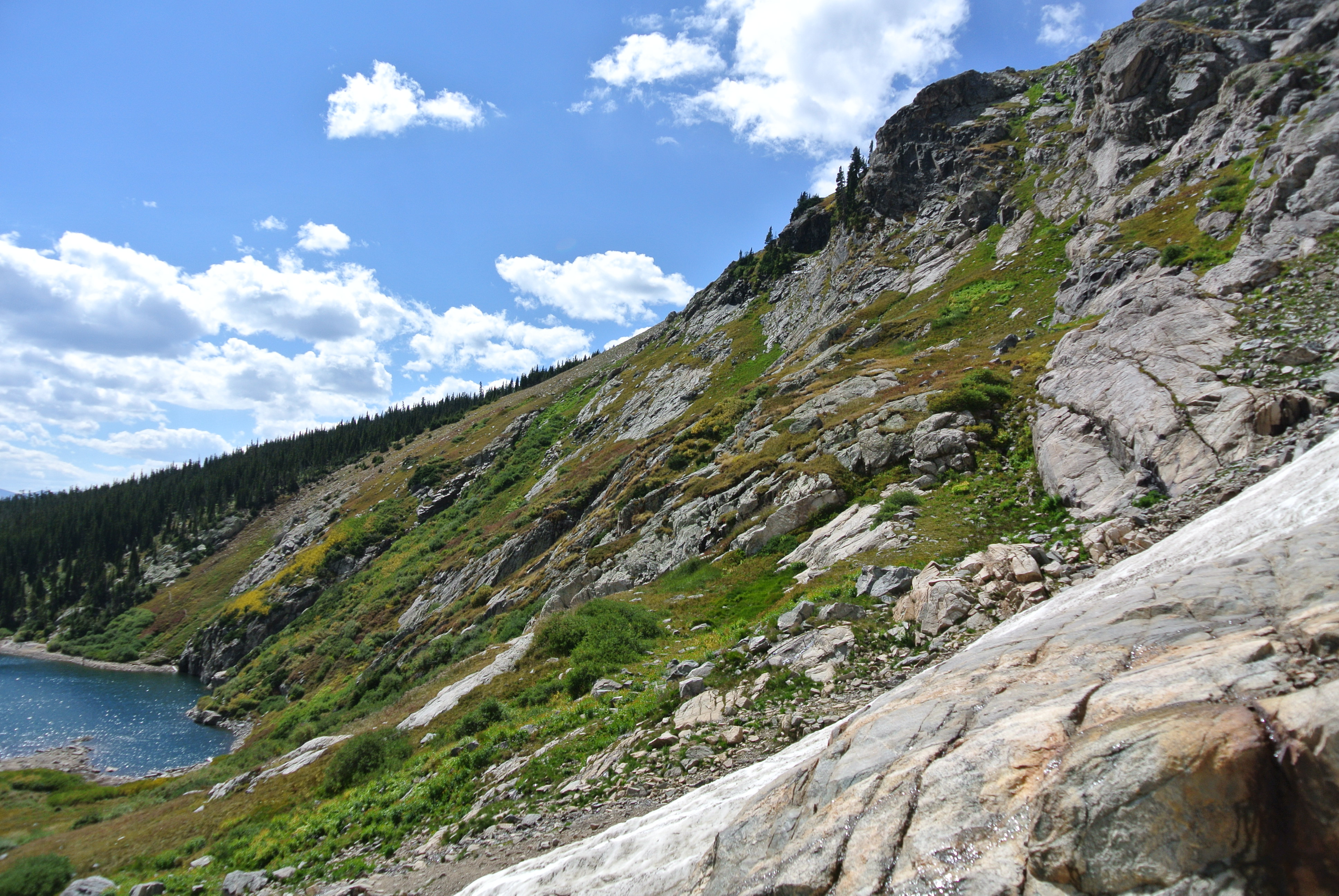 The trail winds around the right side of the lake straight up the rocks. We went in August and there was still a large snow field up and over the ridge. We scrambled along the edge for a while until we came across a group of geologists measuring the depth of the ice. We paused for a bit to watch their work.